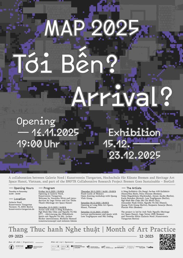 Der Month of Art Practice (MAP) ist ein jährlich stattfindendes Projekt des Heritage Art Space in Hanoi, Vietnam, und dient als Plattform für den Austausch künstlerischer Strategien, kollektives Arbeiten und nachhaltige, interkulturelle Dialoge. Internationale Künstler:innen kommen hier mit Absolvent:innen der Kunsthochschulen zusammen, um gemeinsam eine künstlerische Praxis und thematische Ausstellungen zu entwickeln. In Kooperation mit der Hochschule für Künste Bremen wurde dieses Format um eine Arbeitsgruppe in Deutschland erweitert. In einem kollaborativen Prozess werden seit 2022 diverse Sichtweisen auf das Thema Mobilität in analogen und digitalen Formaten erarbeitet und realisiert. Aus multidisziplinären Perspektiven blicken die Künstler:innen auf die Bewegung von Menschen, Gütern, Ideen und immateriellen Dingen sowie auf die Spuren, die hinterlassen werden.