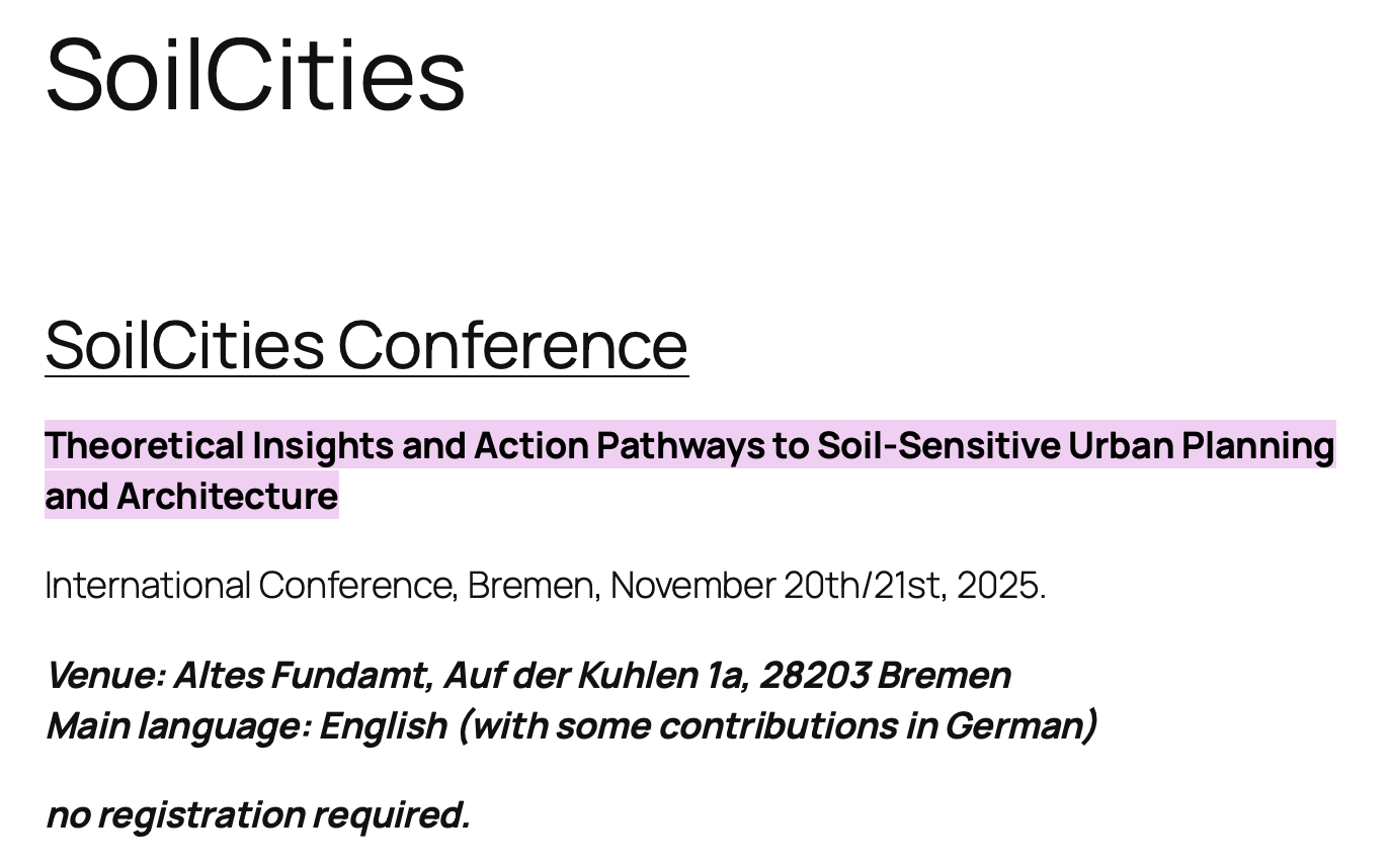 Bringing together specialists from anthropology, architecture, art, landscape architecture, soil science and urban planning from Europe and Latin America, the conference addresses soil as a decisive force for urban development and explores how restoring soil health can reactivate vital ecosystem services for cities. The conference fosters integrated research and the application of soil health measures in urban and peri-urban contexts, structured around three thematic strands: i) Soil-Sensitive Urbanism: A Comprehensive Vision of Soil for Cities; (ii) Urban Design & Architecture: Soil-Sensitive Cities, Public Spaces and Buildings; (iii) Hands-On: Concrete Measures for Soil-Sensitive Cities and Soil Literacy.
